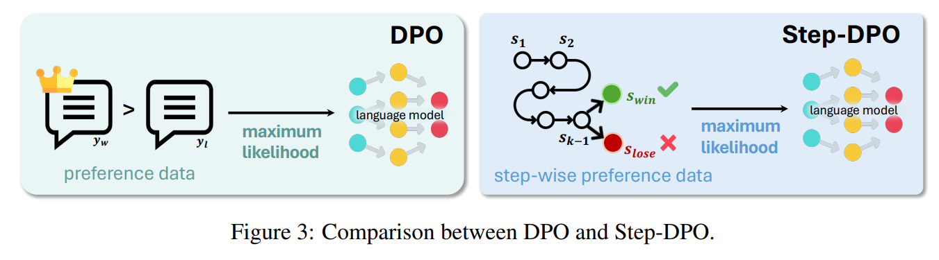 - vanilla DPO는 p(y_win|x) 와 p(y_lose|x) 사이의 preference optimization만 고려하지만 Step-DPO는 p(s_win|x; s1, s2, s3, ... , sk-1)을 최대화하고, p(s_lose|x; s1, s2, ..., sk-1)을 최소하는 하는 방향으로 optimization함