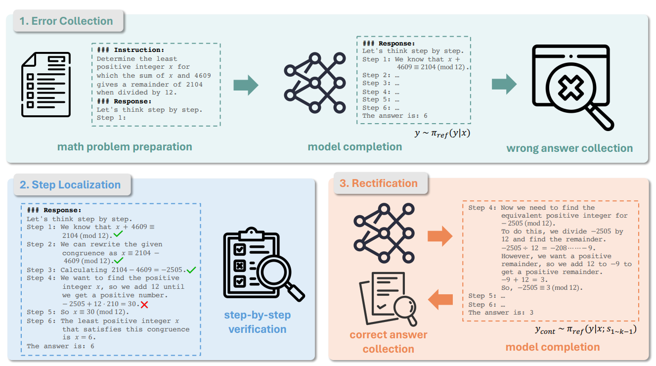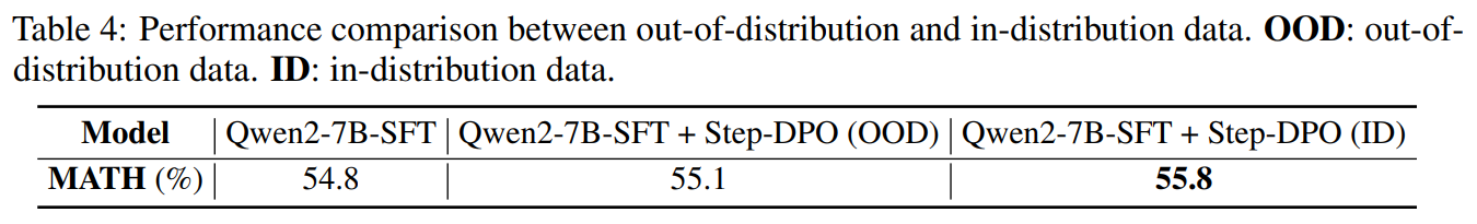 - DPO는 long-chain mathematical reasoning task에서 낮은 개선을 보임: numerous reasoning step에서 발생하는 작은 error가 틀린 정답으로 이어짐 (*결국 사람은 올바른 정답을 선호하니 선호하는 답변을 생성하는 것이 정확한 정답을 생성하는 것임)