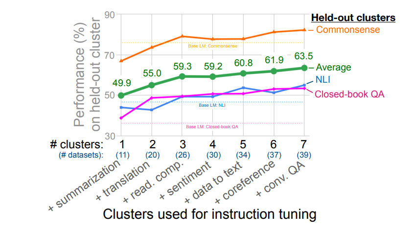 - unseen task에서 zero-shot 능력을 보이려면 그만큼 많은 데이터셋으로 instruction tunining을 진행해야함