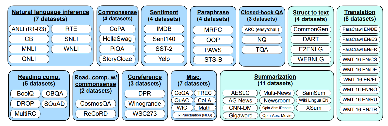 - unseen task에 대한 zero-shot 성능을 측정하기 위해 NLP dataset을 task type에 따라 clsutering함