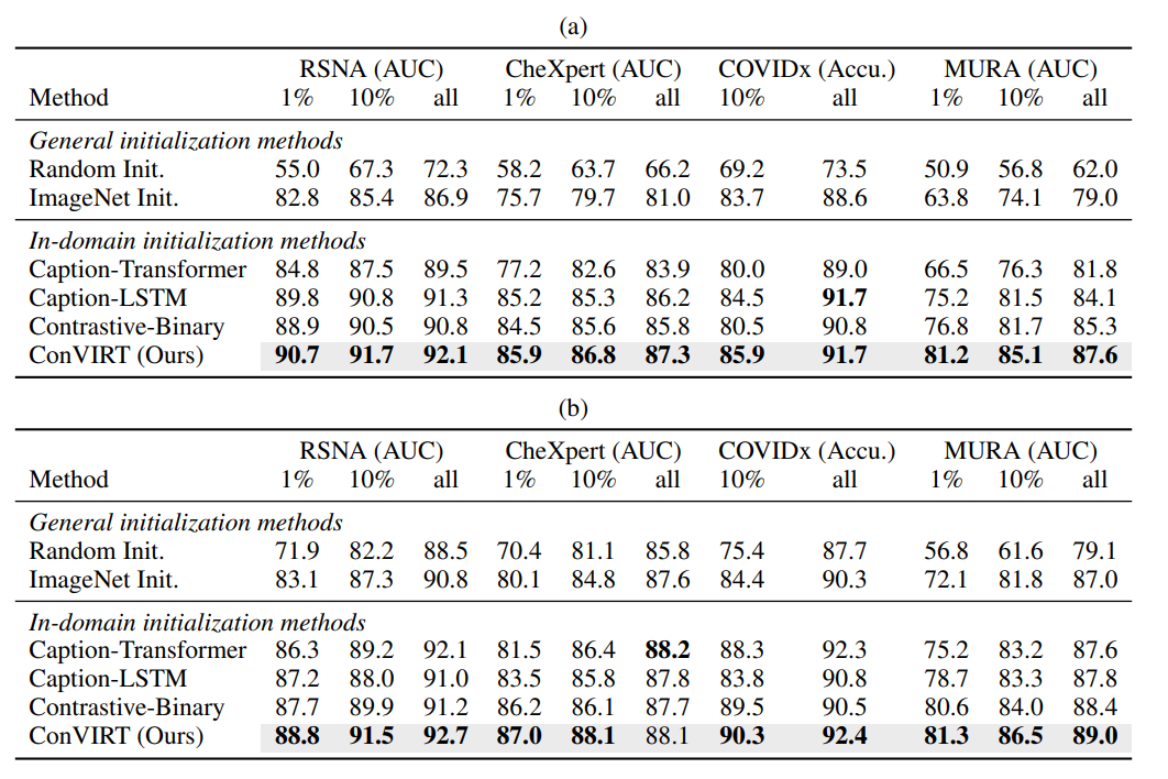 - 우리의 ConVIRT 방식으로 pretraining하면 10%의 데이터만 있어도 ImageNet pretraining initialize와 같거나 우수한 성능을 낼 수 있음