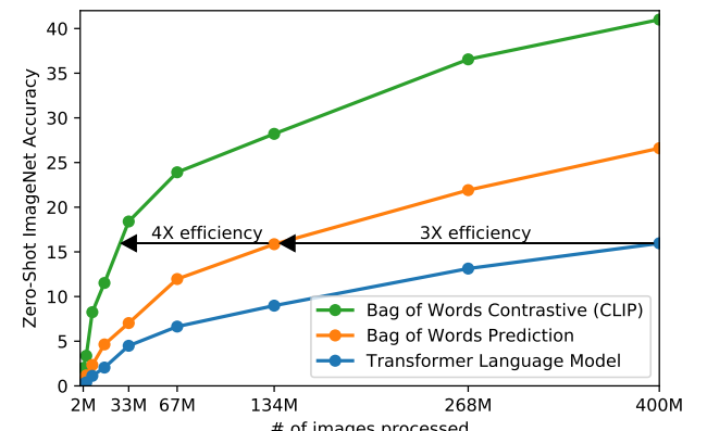 - 앞선 연구들과 비교했을 때 이미지 인코더는 그대로 사용하고, 텍스트 인코더는 BoW 형식으로 예측하여서, 대조학습으로 학습하는게 가장 효율적이었음