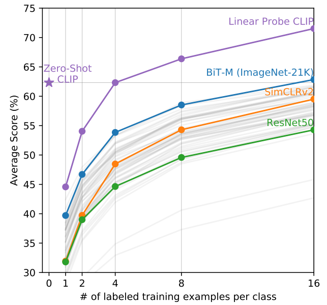 - Zero-shot, few-shot, linear probe clip이 각각 무슨 차이인지? -> zero-shot은 논문 그림에 있는거 그대로, linear probe clip은 이미지 인코더가 생성한 임베딩 벡터를 logistic regression layer로 다시 학습한 모델, 이 때 데이터를 몇개만 쓰면 few-shot clip
