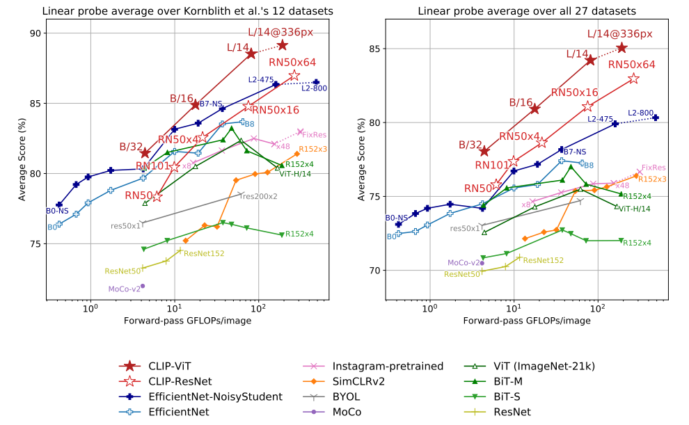 - CLIP 논문은 zero-shot clip을 제안하기는 하였으나, 기존 SOTA 모델들은 full-finetuning으로 성능을 보고 했기 때문에 같은 환경에서 비교하기 위해서 논문의 저자들도 linear probe clip으로 비교