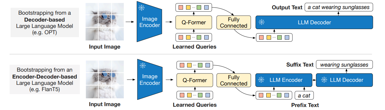 - Encoder-Decoder-based LLM: Decoder-only LLM과 같이 learned queries를 생성 -> learned queires와 함꼐 prefix text가 LLM decoder로 들어감