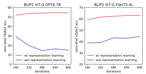 - representation learning을 제거할 경우, 성능이 많이 감소함 -> frozen 모델 사이의 갭이 발생한다 -> Q-Formal가 modality gap의 bridge 역할을
