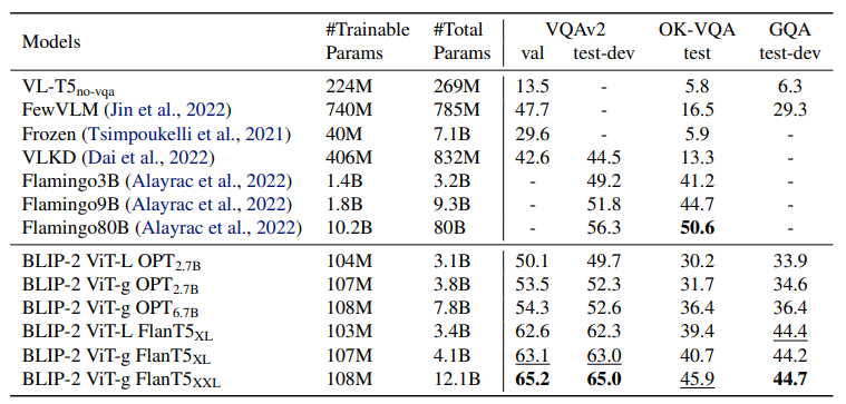 Zero-shot VQA에서 54x 적은 trainable parameters Flamingo 80B보다 높은 성능 달