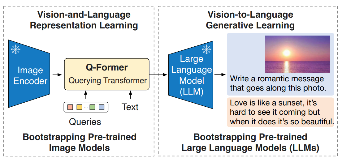 - Vision 모델과 language 모델을 잇는 bottleneck 역할을 수행하도록 Q-Former만 단독으로 학습시키자