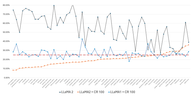 - LLaMA 1 의 경우 25%의 성능으로 정말 정답을 모른다고 할 수 있음